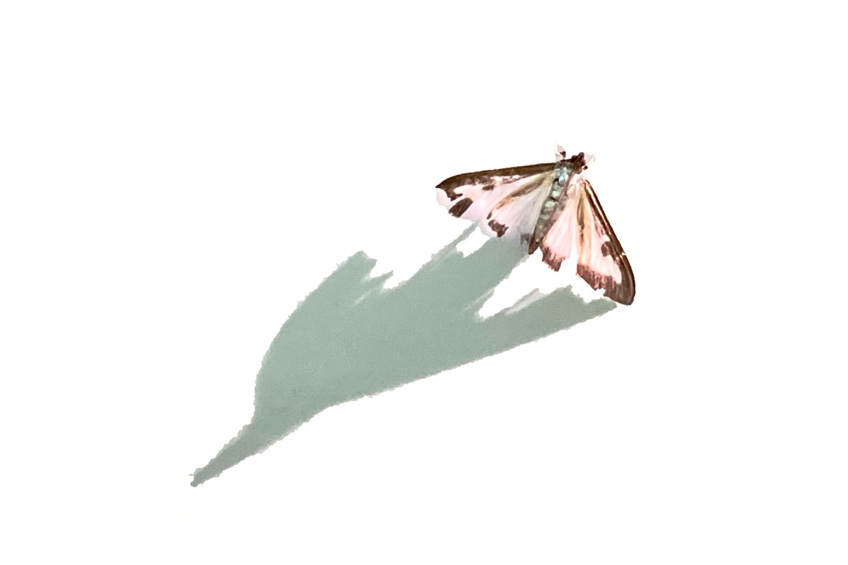 Vervolgens trof ik ’s-avonds op de wand van onze caravan een gevleugeld insect aan. Het avond licht maakte de vleugels enigszins transparant en wierp een schaduw op de (witte) caravan